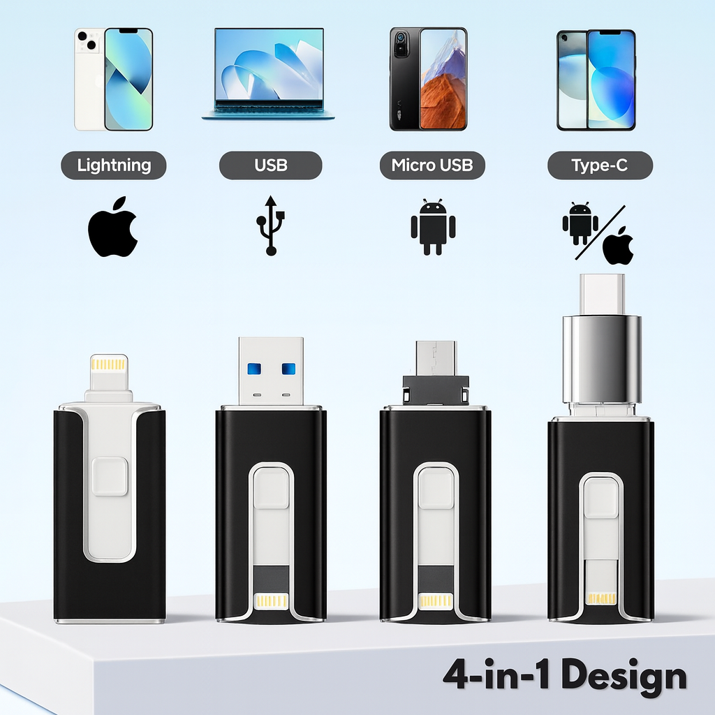 DataNyckel™ fungerar med iPhone, Android, Mac & PC direkt ur förpackningen. Med inbyggda Lightning-, USB-C-, Micro-USB- och USB 3.0-kontakter passar den nästan alla enheter du kan tänka dig.