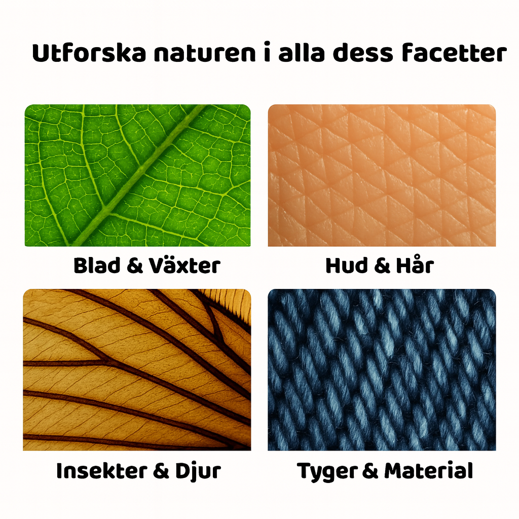 På bara några sekunder kan ditt barn utforska den osynliga världen under ytan — bladens tunna ådror, mönstren på en insektsvinge, strukturen i tyg eller små luftbubblor i en droppe vatten. Med 1000x förstoring blir det vanliga magiskt, och vetenskap blir till lek.