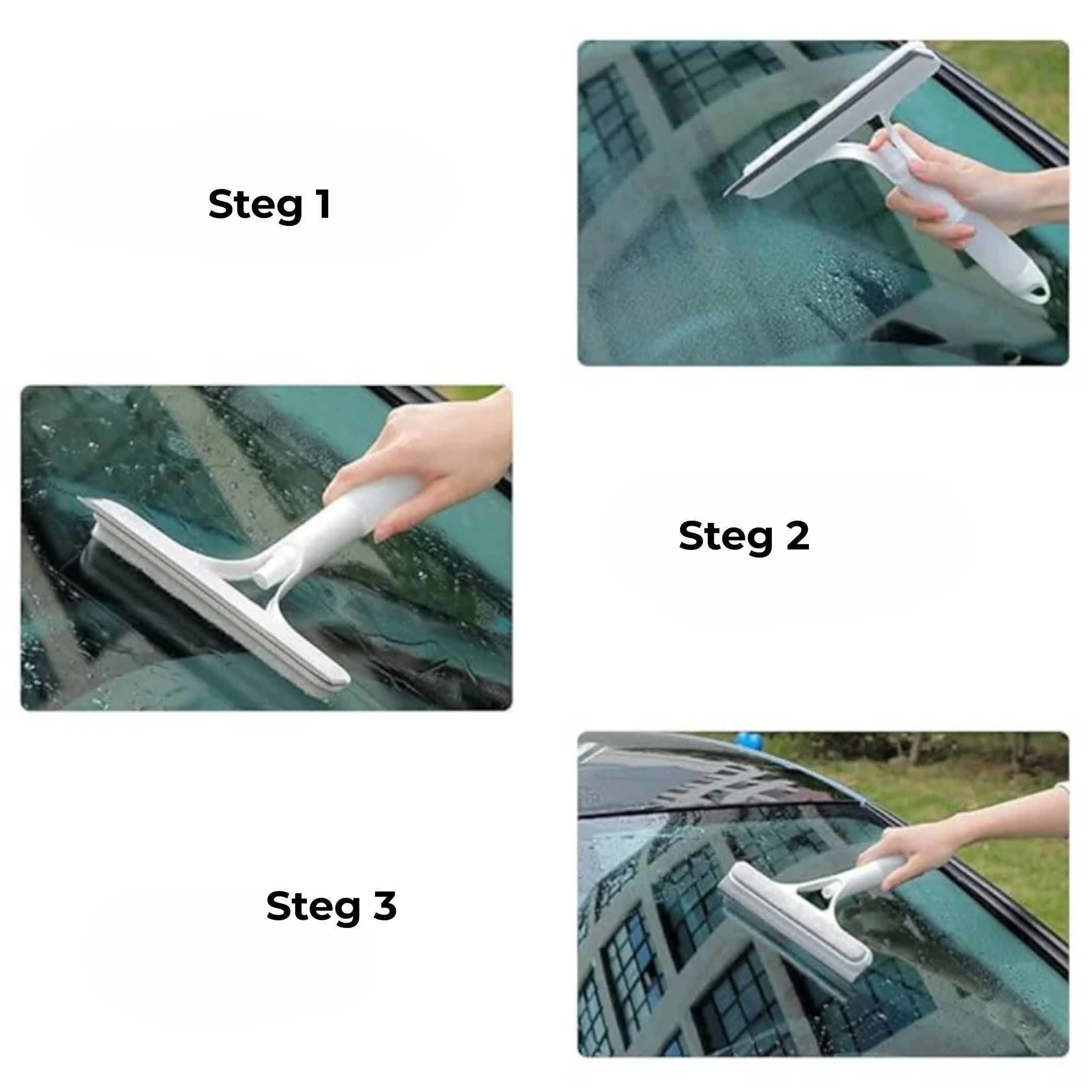 GlasRen™ är utrustad med en integrerad spraybehållare, en mjuk rengöringsborste och en silikonskrapa. Detta gör att du kan spraya, rengöra och skrapa torrt i en enda smidig rörelse—utan separata verktyg eller extra ansträngning.