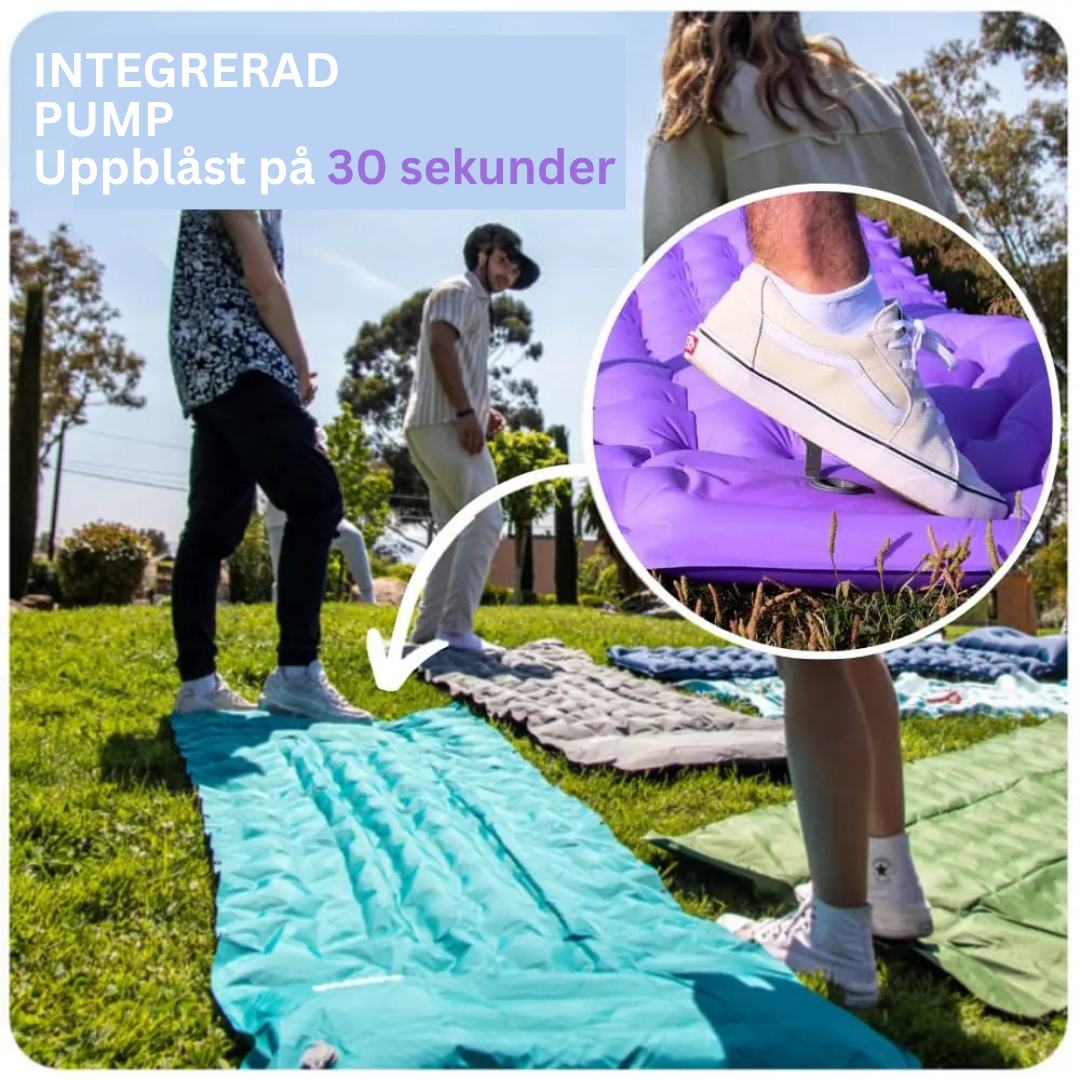 Vi har utvecklat den enda uppblåsbara madrassen i världen som kan användas utanför tält och dessutom är 100 % vattentät.