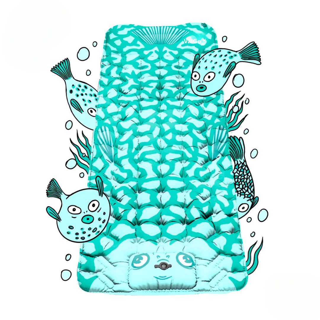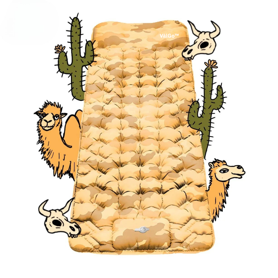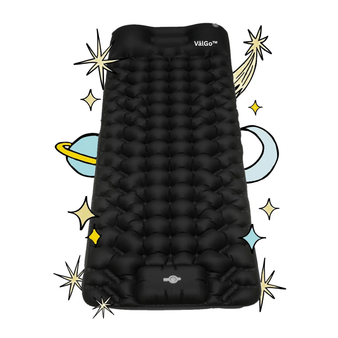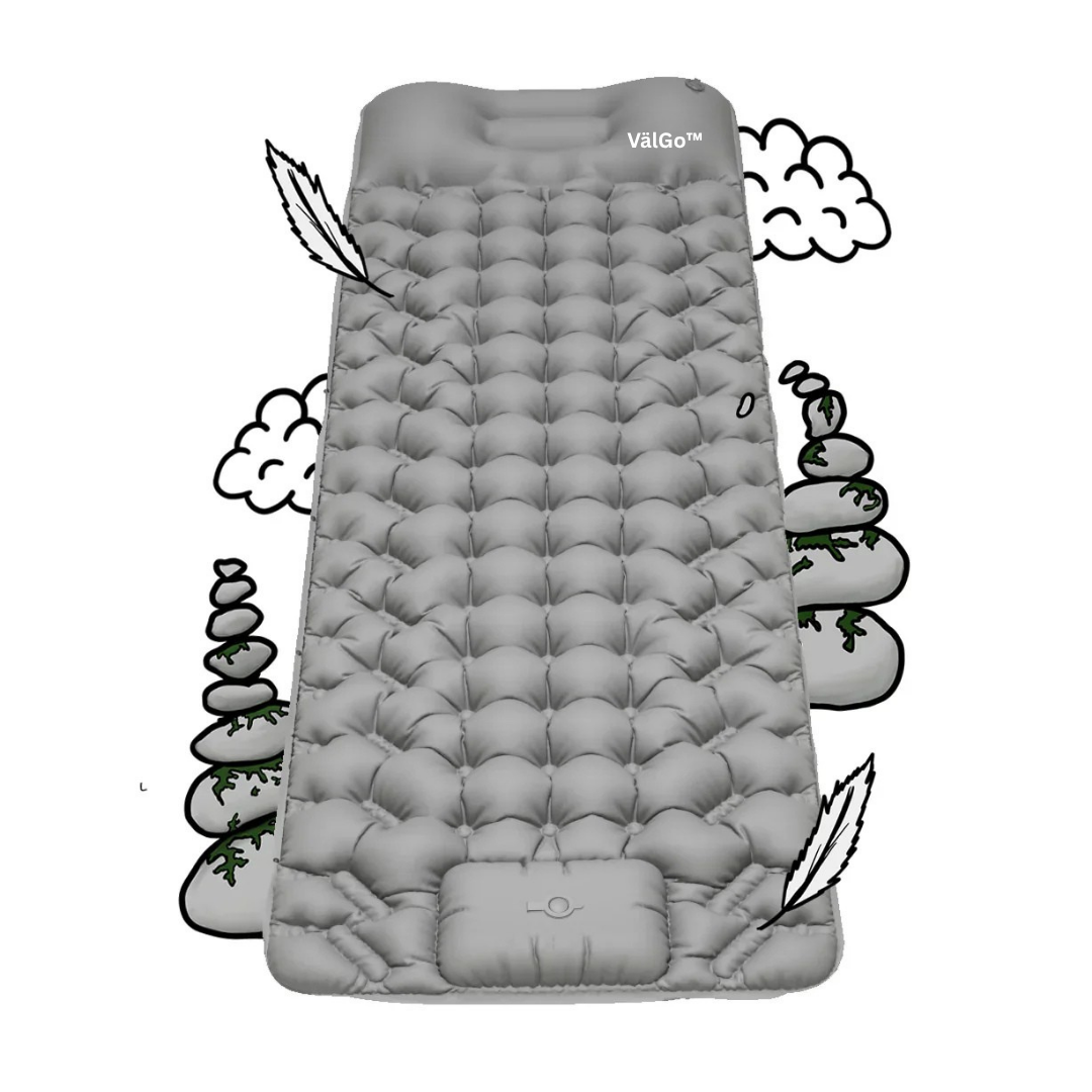 VälGo™ är en ultralätt luftmadrass i storlek med en vanlig vattenflaska – perfekt att ta med i väskan på varje äventyr. Tack vare den integrerade pumpen i botten blåser du enkelt upp madrassen på bara 30 sekunder, helt utan ansträngning. Idealisk för både spontana utflykter och planerade resor.